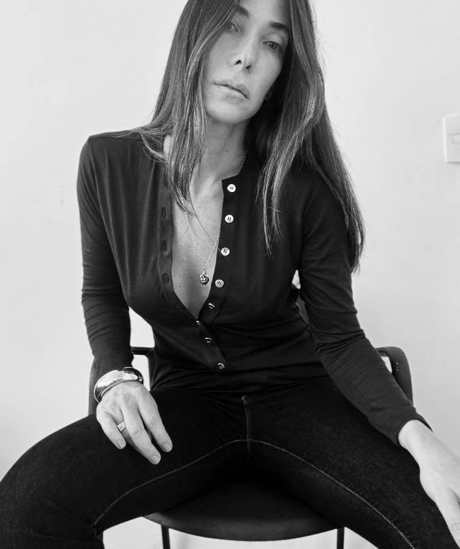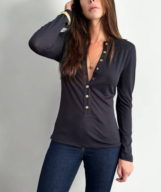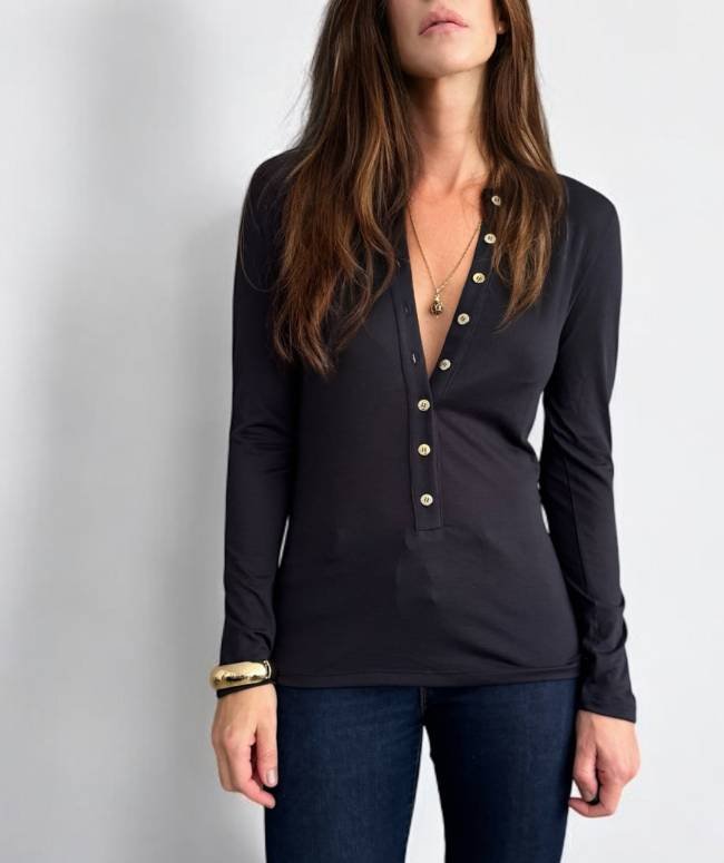 A Blusa Mince é uma peça de malha, na cor azul profundo e possui pequenos botões dourados em toda a sua abertura de decote.