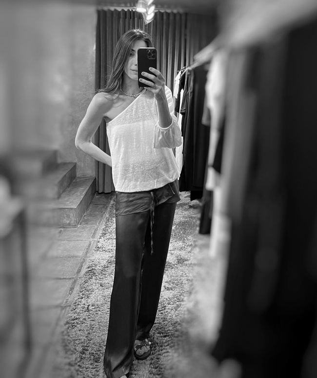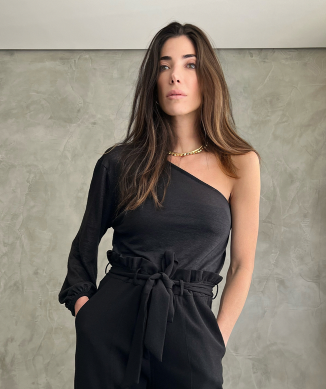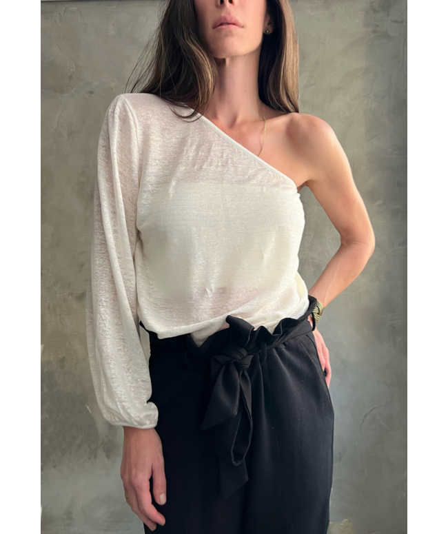 Blusa em malha de linho, manga única, com leve transparência e acabamento em tricot. A Blusa Sarah vai deixar seu look moderno, leve e fresco.