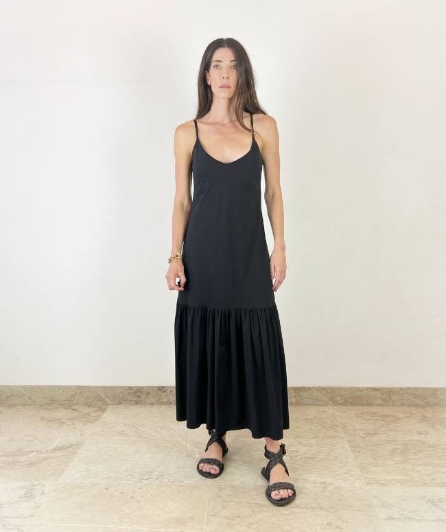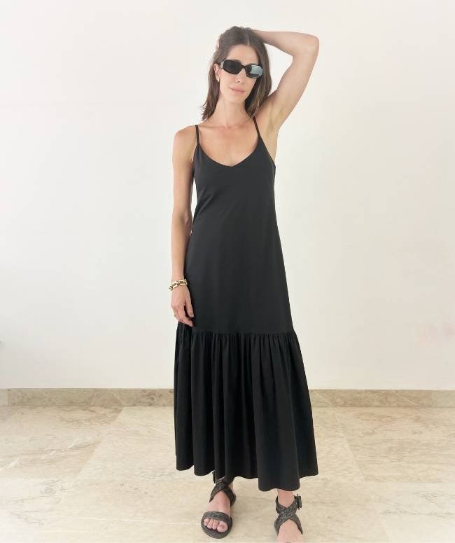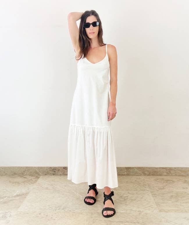 Vestido de comprimento mid em tricoline, forrado ate a altura da costura na saia. As alcinhas são fininhas e reguláveis. Zimper invisivel nas costas. O Vestido Maxinne é limpo. Aceita qualquer peça com ele. Acessório? Perfume? You choose. Chic. Discreto.